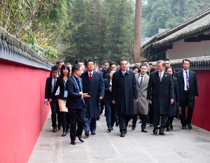 下午3时许,李克强在草堂大廨台阶前迎接韩国总统文在寅、日本首相安倍晋三。随后,三国领导人参观了诗史堂、柴门并认真地听取讲解。