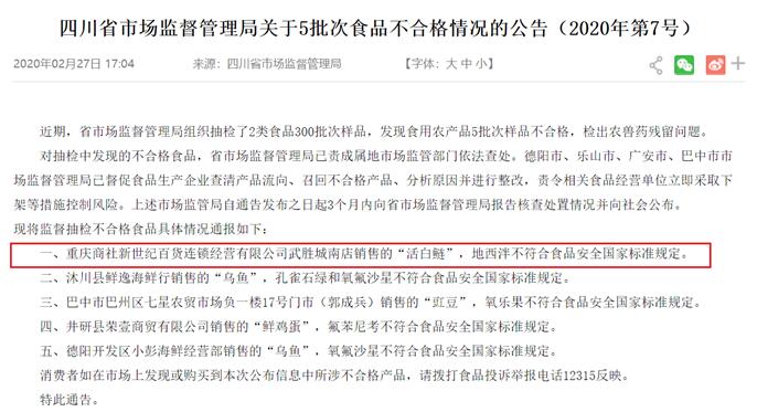重庆新世纪百货活白鲢抽检不合格 为重庆百货子公司