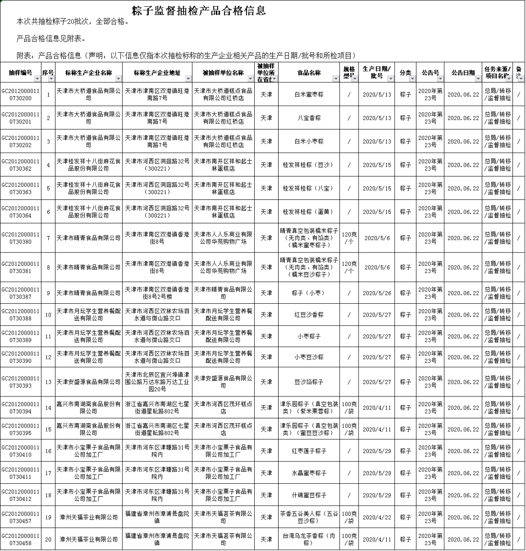 端午节前夕,根据《中华人民共和国食品安全法》和《食品安全抽样检验管理办法》等规定,我委组织开展粽子监督抽检,共抽检粽子样品20批次,全部合格。