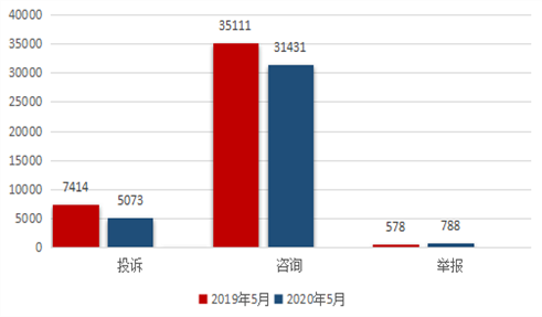 2020年5月份,12315投诉举报指挥中心受理消费者投诉5073件,业务咨询31431件,违法举报788件,共计37292件,与去年同期相比下降了13.5%。已办复36353件,办复率97.5%,挽回经济损失220.2万元。通过微信公众号发布消费提示、市场监管动态、新闻资讯30篇。