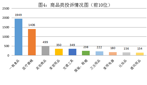 从商品消费类型来看,第一季度商品消费类投诉主要集中在一般食品、医疗器械、其他商品、家居用品、交通工具、服装鞋帽、卫生用品、家用电器、化妆品、通讯用品等。一般食品和医疗器械的投诉量较多,分别占商品类比例的29.52%和21.3%。