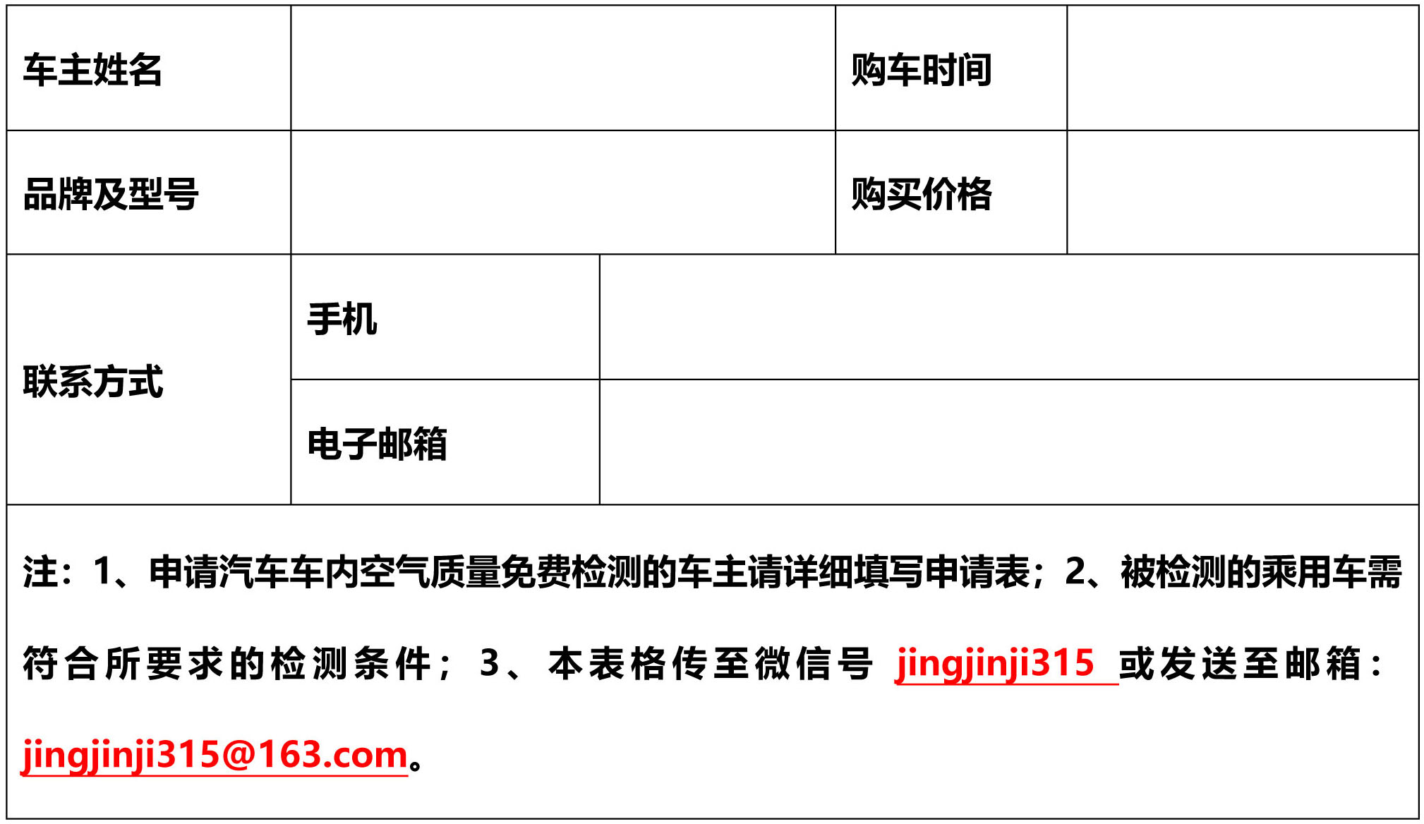 为确保此次比较试验的客观公正性,检测用车将采取公开征集的形式,欲参加此次免费检测活动的车主均可自愿报名参加。报名方式为:1.添加微信号沟通报名,微信号为:jingjinji315;2.发送报名信息至邮箱:jingjinji315@163.com。