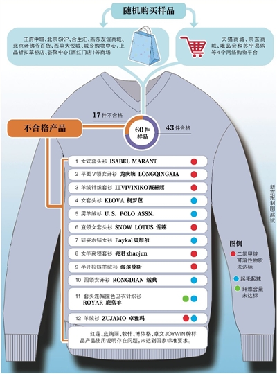 北京市消费者协会工作人员,以普通消费者的身份,在北京市的王府中環、北京SKP、燕莎友谊商城、北京老佛爷百货、西单大悦城、上品折扣草桥店等商场,以及天猫商城、京东商城、唯品会和苏宁易购等4个网络购物平台随机购买了60件羊绒衫,价格从380元至8588元不等,对样品的产品使用说明、纤维含量、起毛起球等指标进行比较试验,其中17件存在不同问题。