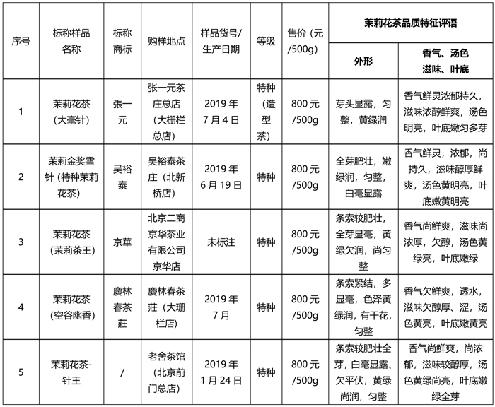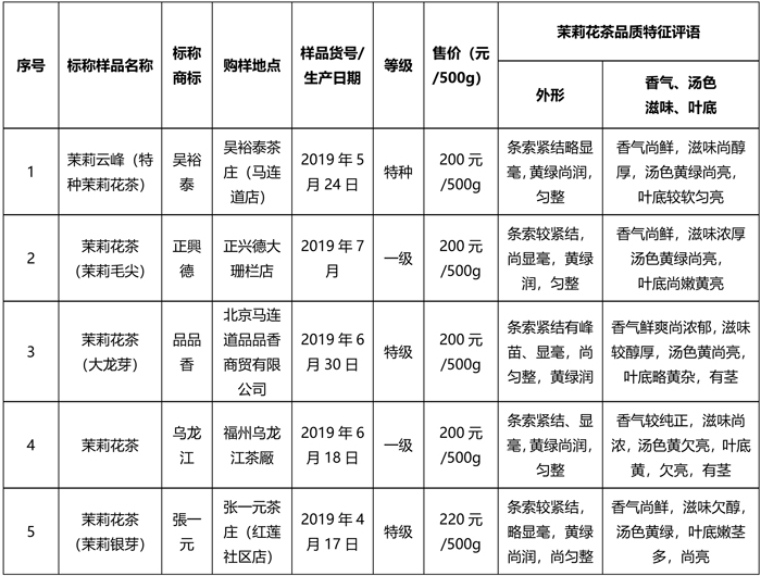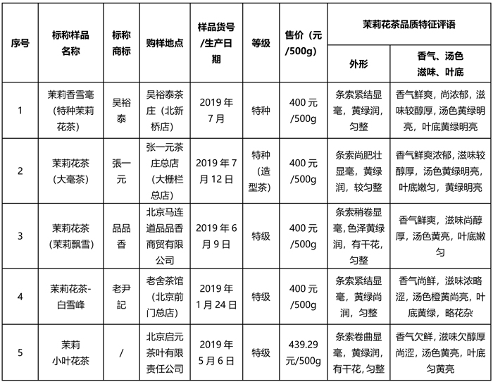 结果显示,茉莉花茶样品水分、茉莉花干和安全指标农药残留结果均在标准要求范围之内,表现良好。此次比较试验分别对200档、400档、800档的茉莉花茶进行了感官品质分析,同一档价格的茉莉花茶在品质特征上有所差别,每档推出5款品质特征较好的样品,供消费者在购买时参考。