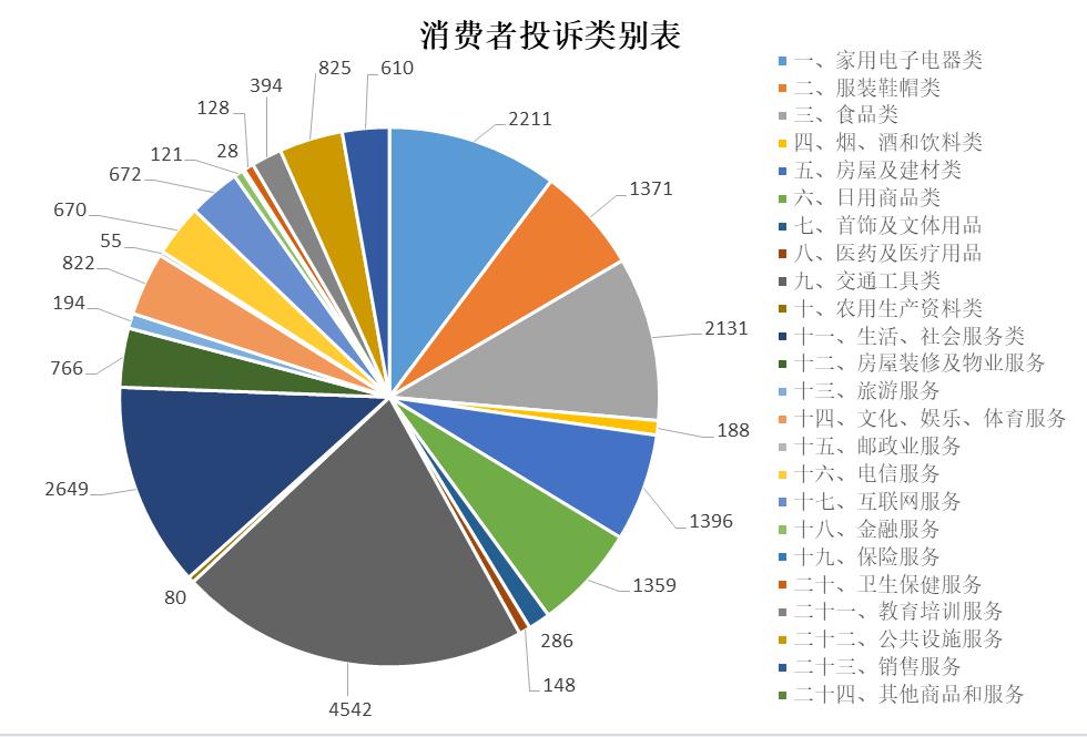 全部投诉中,交通工具类投诉4542件,占投诉量的18.96%;生活、社会服务类投诉2649件,占投诉量的11.06%;家用电子电器类2211件,占投诉量的9.23%; 食品类投诉2131件,占投诉量的8.89%;房屋及建材类投诉1396件,占投诉量的5.83%;其它为日用商品类、房屋装修及物业服务类、文化娱乐类、旅游服务类、电信服务类、互联网服务、邮政快递服务、金融服务、保险服务等。