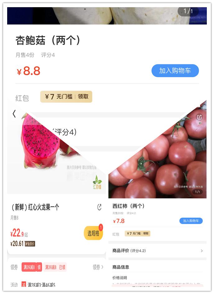 京东到家菜加壹宁国路店,商品网页显示西红柿特价4.9元/份,加入购物车付款时,商户却以原价6.2元/份进行了结算。