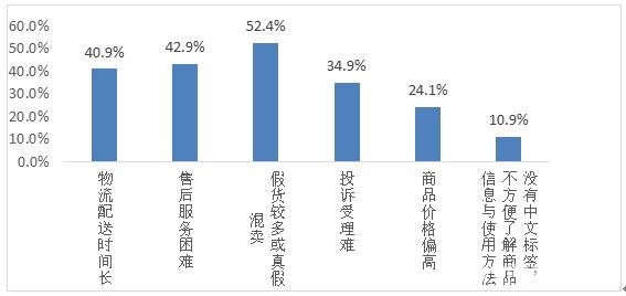 2. 52.4%的受访者遭遇过跨境电商商品售假问题。当问及受访者通过跨境电商购买商品的有关情况时,调查结果显示, 52.4%的受访者遇到假货较多或真假混卖的问题;42.9%的受访者遇到售后服务困难的问题;40.9%的受访者遇到物流配送时间长的问题;34.9%的受访者遇到投诉受理难的问题。