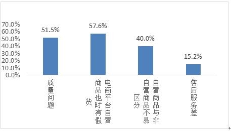 1. 57.6%的受访者遇到过平台自营商品售假问题。当问及受访者通过网络平台购买自营商品的有关情况时,调查结果显示,57.6%的受访者遇到假货的问题;51.5%的受访者遇到过质量问题;40.0%的受访者认为自营商品与非自营商品不易区分。