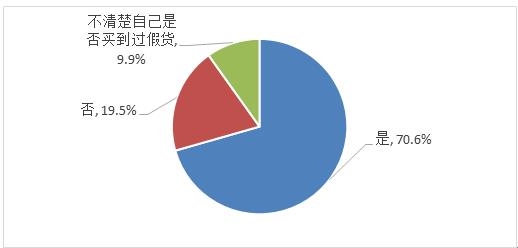 2. 70.6%的受访者反映在电商平台上购买过假货。调查结果显示,购买到假货的受访者占比70.6%;仅有19.5%的受访者未购买过假货。