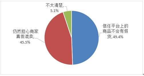 1. 49.4%的受访者信任宣称100%正品或承诺假一赔十的平台无假货。调查结果显示,对于承诺100%正品的平台,49.4%的受访者信任平台上的商品不会有假货;45.5%的受访者仍然担心商家真假混卖。