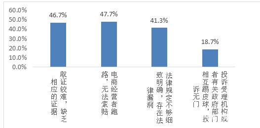 3.取证难、电商经营者跑路是受访者在维权过程中常遇到的问题。调查结果显示,“电商经营者跑路,无法索赔”是受访者在维权过程中最常遇到的问题,占比47.7%;其次是“取证难,缺乏相应的证据”,占比46.7%;“法律法规不够细致明确,存在法律漏洞”问题也十分突出,占比41.3%。