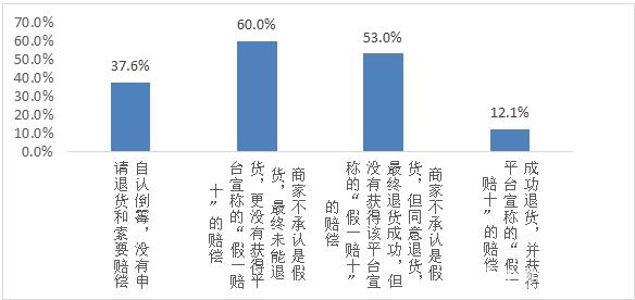 3. 12.1%的受访者成功获得“假一赔十”的赔偿。调查结果显示,大多数受访者在买到假货后未成功获得“假一赔十”的赔偿,其中60%的情况是商家不承认卖假货,最终未能退货,更没有获得平台宣称的“假一赔十”赔偿;53%是商家不承认是假货,但同意退货,最终退货成功,但没有获得“假一赔十”的赔偿;37.6%的受访者自认倒霉,没有申请退货和索要赔偿;仅12.1%的受访者成功退货,并获得“假一赔十”的赔偿。