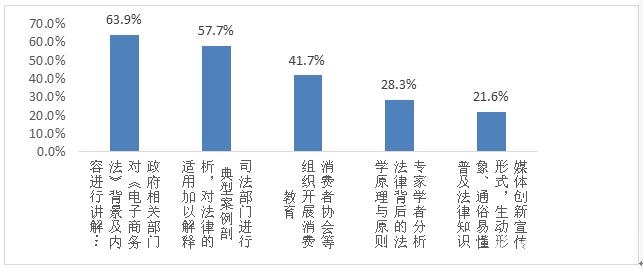 5. 约六成受访者希望通过政府或司法部门学习和理解《电子商务法》。调查结果显示,分别有63.9%和57.7%的受访者希望通过政府和司法部门去学习和理解《电子商务法》;此外,消费者协会、专家学者、媒体等也是重要的学习渠道。