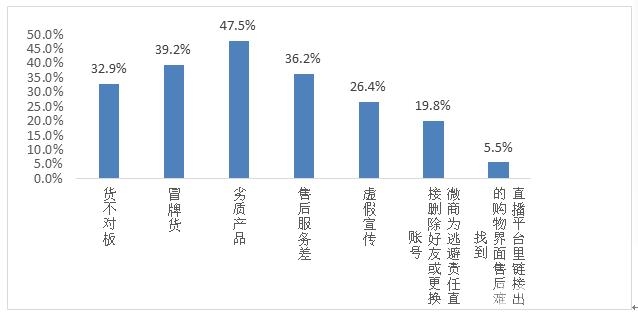 1.劣质产品是微商和直播平台等最突出的违法行为。调查结果显示,在微商和直播平台等新兴网络交易平台遇到“劣质产品”问题的受访者比例最高,占比47.5%;其次是冒牌货和售后服务差等问题,分别占比39.2%和36.2%。