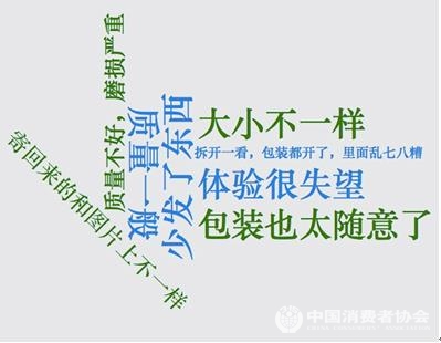 质量是企业之本,是产品的生命,理应摆在第一位考虑。产品质量一直是消费者网络消费的心头病,有的消费者反映,自己在电商平台上购买了某知名品牌酒,“还没喝,但是酒瓶盖上的防伪查询说是非法代码,等于没通过真酒验证,担心质量”;有的消费者吐露自己在电商平台上购买连衣裙的经历,“颜色和图片的不一样,开岔的地方还露的里子布呢,没法往出穿”;还有消费者吐槽,在电商平台买了一台电脑,“用了一周不到,死机两次,经常黑屏,使用过程中很卡,只能说一分钱一分货”。通过互联网舆情数据分析,绘制出电商平台产品质量问题的词云分析图,可以看出,消费者普遍关注产品本身质量(质量一般、质量不好、磨损严重)、产品包装(包装太随意)、产品描述真实性(寄回来的和图片上不一样、大小不一样)等问题。