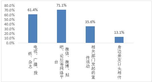 2.微信、微博、贴吧、论坛等网络平台是受访者了解《电子商务法》的主要渠道。在对受访者了解《电子商务法》的渠道的调查中,通过“微信、微博、贴吧、论坛等网络平台”了解《电子商务法》的受访者最多,占比71.1%;其次是通过“电视、广播、报纸、杂志”来了解,占比61.4%;通过“相关部门发起的宣传活动”及“身边亲友口头相传”了解的较少,分别占比35.6%和13.1%。
