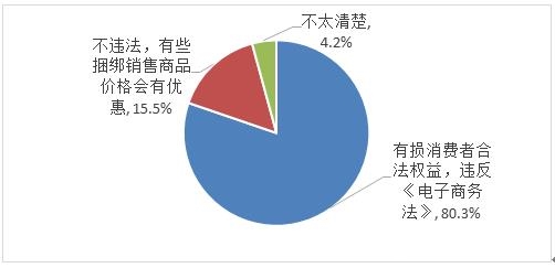 6. 80.3%的受访者认为捆绑销售违反《电子商务法》。在对消费者进行捆绑销售是否违法的调查时,80.3%的受访者认为捆绑销售有损消费者合法权益,违反《电子商务法》;而15.5%的受访者则认为不违法,有些捆绑销售商品会有优惠。