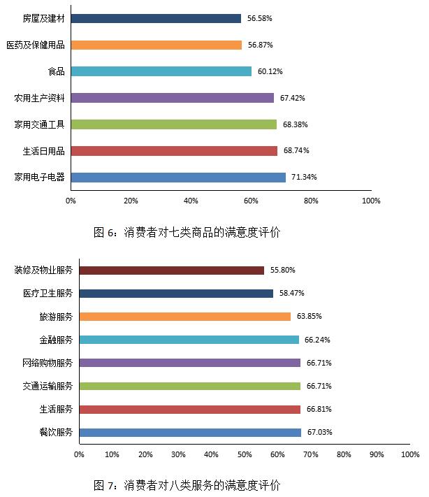 调查显示,消费者对七类商品的综合满意度为64.21%,对八个服务行业的综合满意度为63.95%,服务行业的满意度低于商品类的满意度。究其原因,消费品市场发展较为成熟,行业标准及相关制度较为健全,经营行为有了明确的规范要求,消费者权益得到了应有的保障。服务行业,虽有标准,但人为因素影响较大,消费者的感受随之受到影响。本次调查中,房屋及建材建材、医药及保健用品、装修与物业服务的满意度指数偏低。
