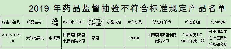 抽检结果显示,3批次药品不符合标准规定。其中,标示由国药集团新疆制药有限公司(以下简称:“国药新疆”)生产的六味地黄丸抽验不符合标准规定。报告书编号为2019YZ0289-JD,生产批号为190318,药品类别为中成药,被抽样单位为国药新疆,检验依据为《中国药典》2015年版一部,检验机构为新疆维吾尔自治区药品检验研究院。