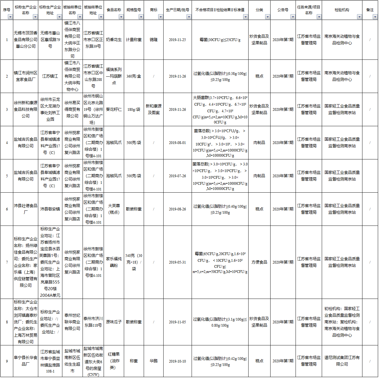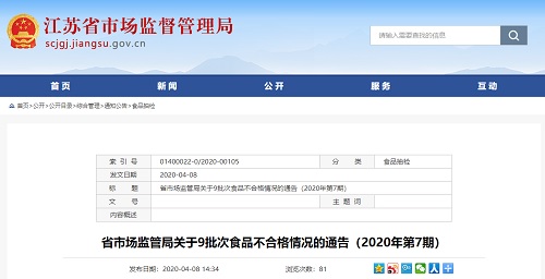 中国质量新闻网讯 2020年4月8日,江苏省市场监督管理局发布关于9批次食品不合格情况的通告(2020年第7期)。据通告,近期,江苏省市场监督管理局完成省级食品安全监督抽检任务458批次,涉及方便食品、肉制品、炒货食品及坚果制品、酒类和糕点等食品。根据食品安全国家标准检验和判定,其中抽样检验项目合格样品449批次、不合格样品9批次。