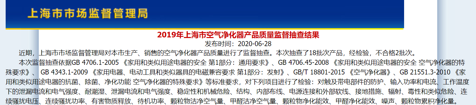 中国质量新闻网讯(广岛)日前,上海市市场监管局官网公布2019年空气净化器产品质量监督抽查结果称,该局对上海市生产、销售的18批次空气净化器产品进行了监督抽查,经检验,不合格2批次。