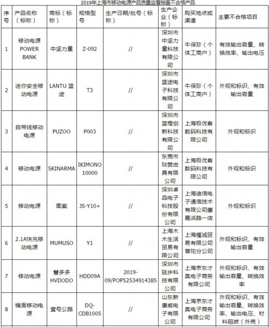 上海市市场监督管理局网站17日公布《2019年上海市移动电源产品质量监督抽查结果》显示,近期,上海市市场监督管理局对本市销售的移动电源产品质量进行了监督抽查,本次抽查了30批次产品,经检验,不合格11批次。