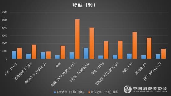 试验分别在样品最大功率、最小功率状态下,测量自电池满电状态运行至自行停止时间,进行3次测试,取其平均值,获得最小和最大续航时间。在开启最大功率时,11款无绳样品中,续航能力最好的是飞利浦 FC6908/82,达到24分05秒;米家、莱克 M11S、惠而浦P9 均只有7分钟左右。在开启最小功率中,11款普遍提升到20分钟以上,最长续航为戴森V11,可以达到85分钟。