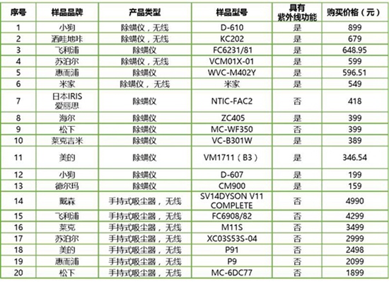 进行比较实验的样品共计20款,价格159元-4990元不等,均宣传具有除螨功能。其中标称为除螨仪类的样品为13台,带有除螨吸头的手持吸尘器类样品7台。样品品牌涉及美的、小狗、戴森、德尔玛、莱克、米家、海尔、苏泊尔、松下、莱克吉米、飞利浦、惠而浦、爱丽丝、洒哇地咔等14个品牌。
