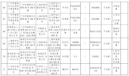抽查结果显示,不合格产品品牌有PIGGLYWIEELY、Levi's 李维斯、ANDREW MACKENZIE、Y-3、MOUSSY、TOUGH Jeansmith、安乃安on&on、6IXTY8IGHT等。