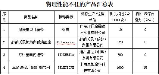 本次比较试验中分别有4件样品的耐洗刷性和3件样品的耐沾污综合能力较差,其中标称由广东江门涂霸建材实业有限公司生产的健康宝贝儿童漆(标称商标:涂霸;标称规格型号:A1603),其耐洗刷性仅为10次,耐沾污综合能力为0,表明其产品不耐脏,不适宜清洁,耐洗涤擦拭的能力较差。