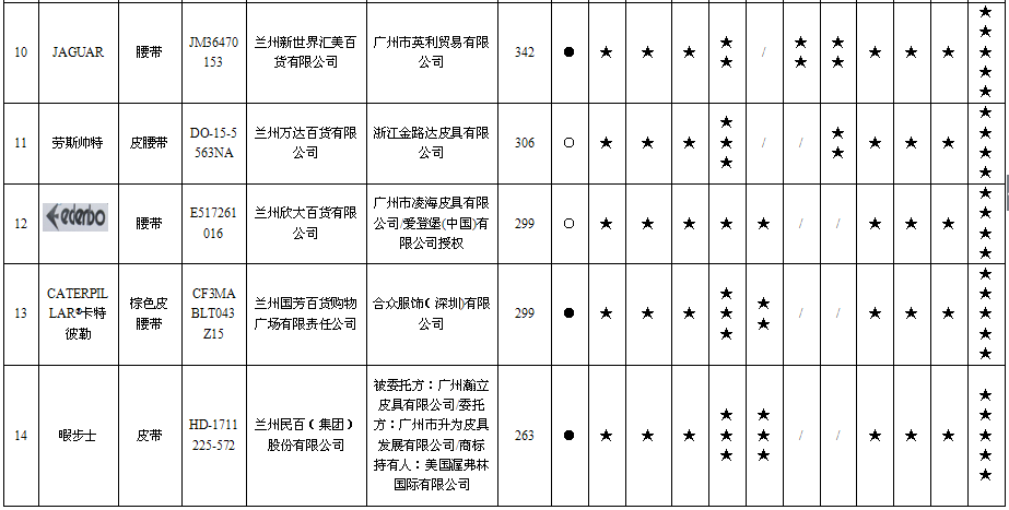 15 | 皮带 | | JH5710320 | 兰州国芳百货购物广场有限责任公司 | 九牧王股份有限公司 | 应符合QB/T 1618-2006《皮腰带》标准要求 | 未标注颜色 | 不符合 |