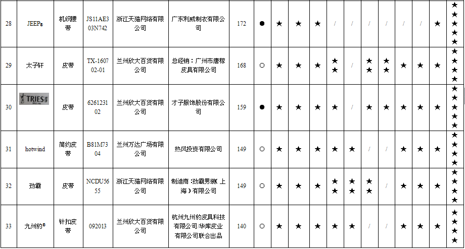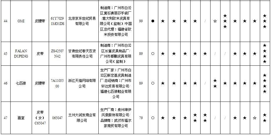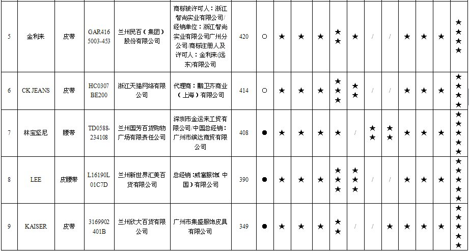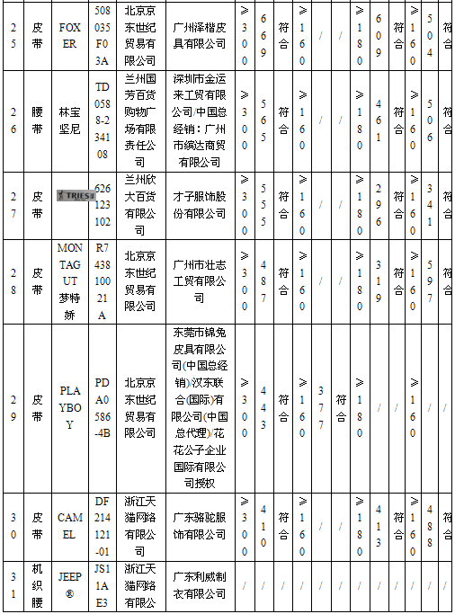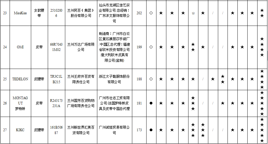 1 | 女款腰带 | MissKiss | 25102006 | 兰州民百(集团)股份有限公司 | 汕头市龙湖区佳艺实业有限公司/总经销:广东洋文服饰有限公司 | ≥300 | 203 | 不符合 |