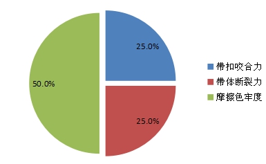 本次比较试验通过对摩擦色牢度、耐汗渍色牢度、带体断裂力、带孔撕裂力、带扣咬合力、带齿咬合力、带扣耐腐蚀性、折裂性能项目的测定,从而分析腰带的耐用性能。从检测结果看,带体断裂力、带孔撕裂力、带扣咬合力和带齿咬合力是腰带是否耐用的主要决定因素,检测结果显示有1个线上样品(标称商标“OMI”皮腰带)的带扣咬合力不符合标准要求,1个线下样品(标称商标“MissKiss”女款腰带)的带体断裂力不符合标准要求,2个线下样品(标称商标“Jeep”皮腰带、标称商标“画室”皮带(女)c65047)的摩擦色牢度低于标准要求。由此可见,本次比较试验选购的腰带产品耐用性能较好。各项目不合格占比情况如图2。