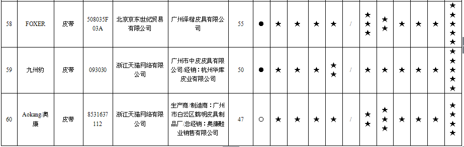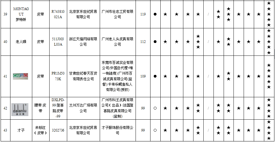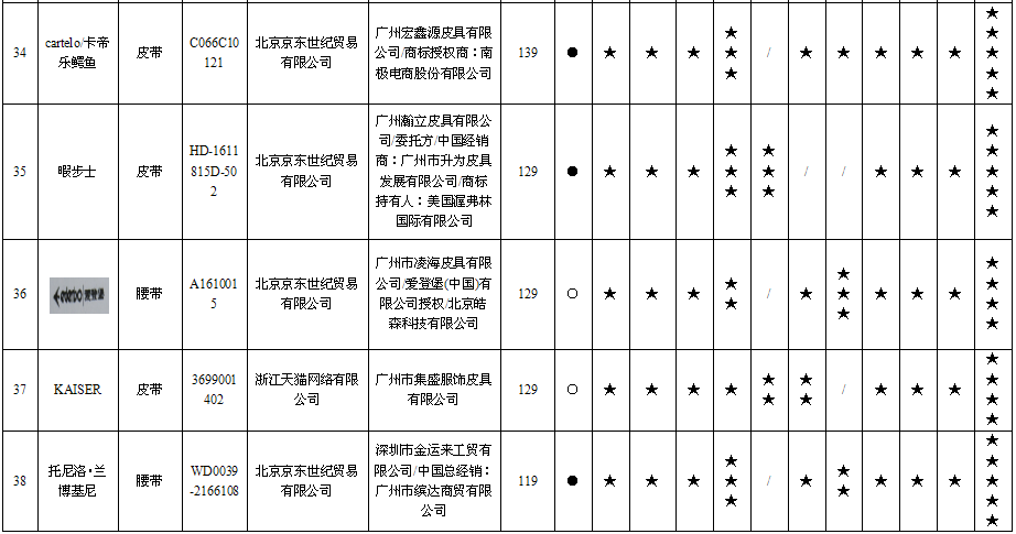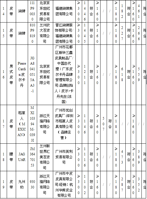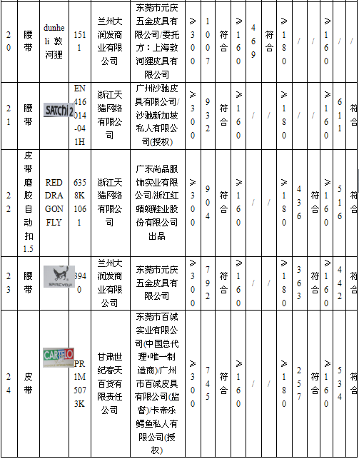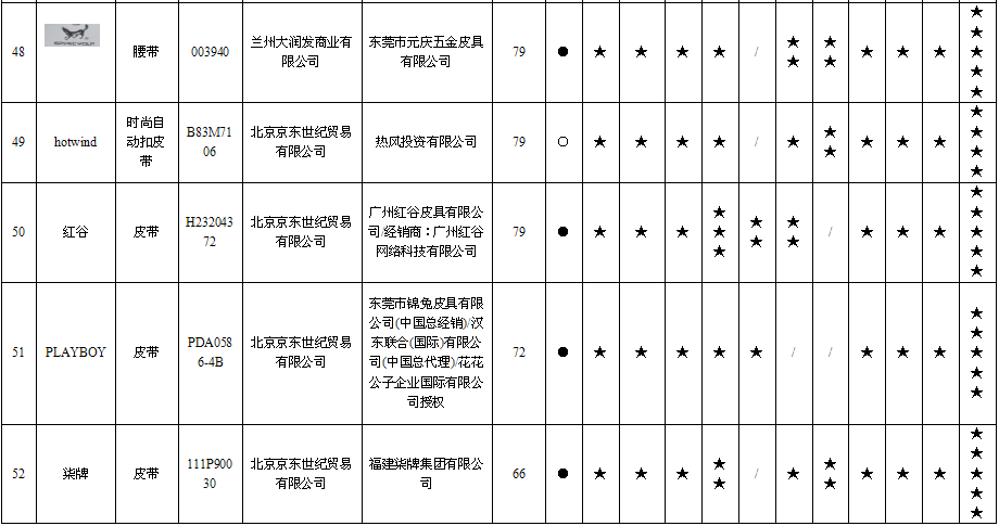 20 | 男式皮带 | | WDC5482A-89 | 北京京东世纪贸易有限公司 | 授权制造经销商:东莞市七好皮具有限公司 | 应符合QB/T 1618-2006《皮腰带》标准要求 | 无出厂(生产)日期 | 不符合 |