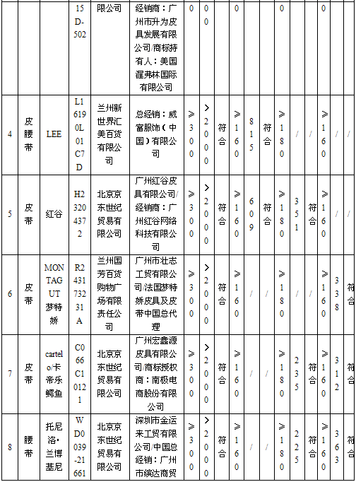 5 | 腰带 | | E517261016 | 兰州欣大百货有限公司 | 广州市凌海皮具有限公司/爱登堡(中国)有限公司授权 | 应符合QB/T 1618-2006《皮腰带》标准要求 | 无出厂日期 | 不符合 |
