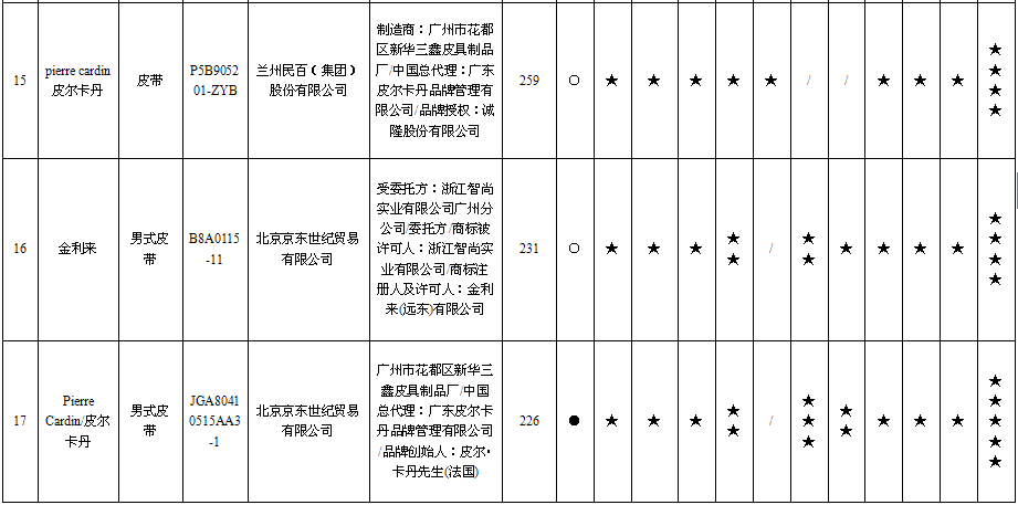 16 | 男式皮带 | 金利来 | B8A0115-11 | 北京京东世纪贸易有限公司 | 受委托方:浙江智尚实业有限公司广州分公司/委托方/商标被许可人:浙江智尚实业有限公司/商标注册人及许可人:金利来(远东)有限公司 | 应符合QB/T 1618-2006《皮腰带》标准要求 | 无出厂(生产)日期 | 不符合 |
