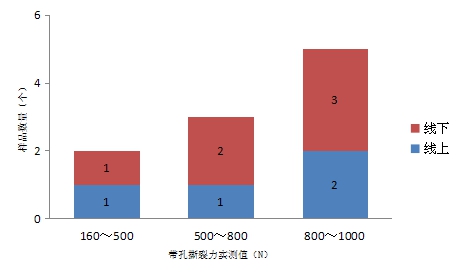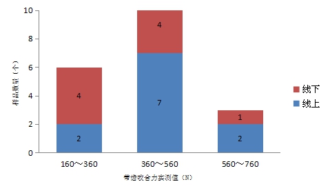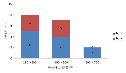 本次比较试验测试的60个腰带样品,其中有1个线下购买的样品的带体断裂力项目不符合标准要求,具体情况见下表所示。(单位:N)