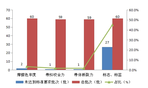 本次比较试验样品,在甘肃省流通领域销售腰带的9个消费场所及线上的2大消费平台分别随机购买,涉及“SATCHI (沙驰)”、“金利来”、“皮尔卡丹”、“七匹狼”、“hotwind”、“梦特娇”等47个品牌。所依据的检测标准为GB 20400-2006 《皮革和毛皮有害物质限量》、QB/T 1618-2006 《皮腰带》、FZ/T 63005-2010《机织腰带》等,实验室按照以上标准对产品的标志标签、外观质量、可分解致癌芳香胺染料、游离甲醛、摩擦色牢度、耐汗渍色牢度、带体断裂力、带孔撕裂力、带扣咬合力、带齿咬合力、带扣耐腐蚀性、折裂性能等指标进行试验检测,可以全面深入地发现腰带产品的质量缺陷,检测结果基本上可以反映目前腰带类产品的质量现状。