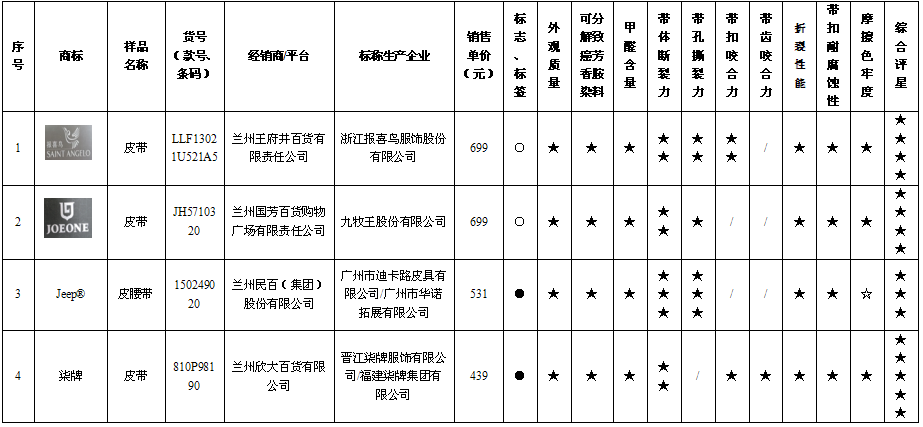 此次比较试验的样品检测项目依据GB 20400-2006 《皮革和毛皮有害物质限量》、QB/T 1618-2006 《皮腰带》、FZ/T 63005-2010《机织腰带》及明示产品标准进行判定,详细比较试验结果如下:
