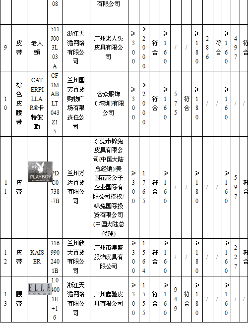 1 | 皮带 | 金利来 | GAR4165003-453 | 兰州民百(集团)股份有限公司 | 商标被许可人:浙江智尚实业有限公司/经销单位:浙江智尚实业有限公司广州分公司/商标注册人及许可人:金利来(远东)有限公司 | 应符合QB/T 1618-2006《皮腰带》标准要求 | 无出厂(生产)日期 | 不符合 |