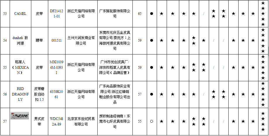 本次比较试验测试的60个腰带样品,结果显示只有1个线上样品(标称商标“OMI”皮腰带)的带扣咬合力项目不符合标准要求,具体情况见下表所示。(单位:N)