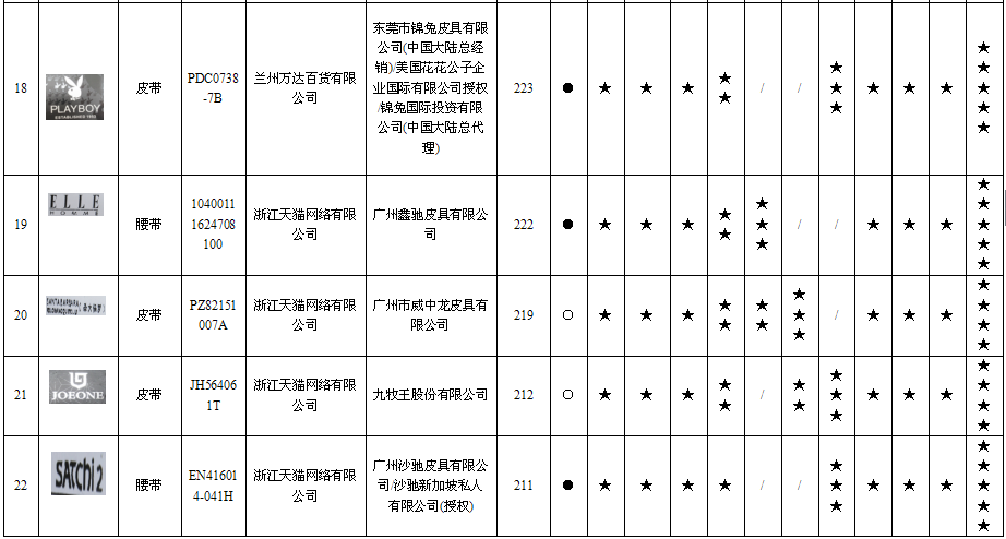 22 | 皮带 | | JH564061T | 浙江天猫网络有限公司 | 九牧王股份有限公司 | 应符合QB/T 1618-2006《皮腰带》标准要求 | 未标注颜色 | 不符合 |