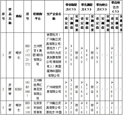 腰带的实用性能主要体现在其力学性能上,带体、带孔、带扣、带齿等关键部位的实际力学指标对腰带产品的使用体验至关重要,因此,力学指标是腰带产品质量检验中一个重要的检验项目,也是体现腰带质量的一个关键性指标。因此,我们对符合标准要求样品的带体断裂、带孔撕裂力、带扣咬合力和带齿咬合力实测值进行对比,从而优中选优,具体情况如下。