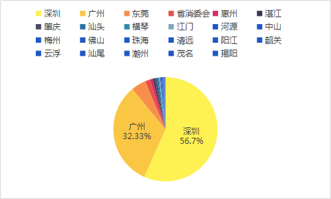 分析发现,消费投诉量与地区经济水平和消费活跃度直接相关。广东是消费大省,消费人口、消费总量多年位列全国第一,增势明显。据统计,2019年广东实现社会消费品零售总额42664.46亿元,同比增长8.0%,已连续36年占据全国榜首。反映在地区分布上,人口基数大、经济消费最为发达活跃的广州、深圳,2019年两地投诉量共332584件,占到全省89.03%(图2),其中深圳211815件,占全省56.7%;珠三角的东莞和惠州投诉量排名也靠前,与其经济发展状况基本相符。与消费投诉量密切相关的因素还有社会发展水平。广东作为改革开放前沿阵地,法制完善,社会管理规范,个人权益得到普遍较好保障。在消费者权益保护方面,投诉渠道畅通便利,维权共治效果明显,特别是消费者组织作用得到较好发挥,有力地激发了消费者投诉维权的积极性。以深圳为例,深圳消委会在力量配备上远超全省甚至全国水平,工作力度强,社会影响大,因受消费者信赖,投诉量较大幅度上升。