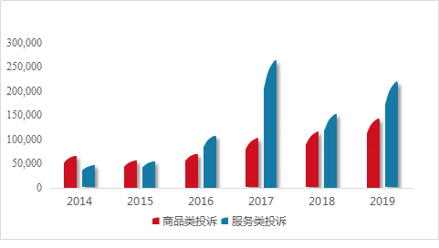 图3:2014-2019年全省消委会系统商品类和服务类投诉量