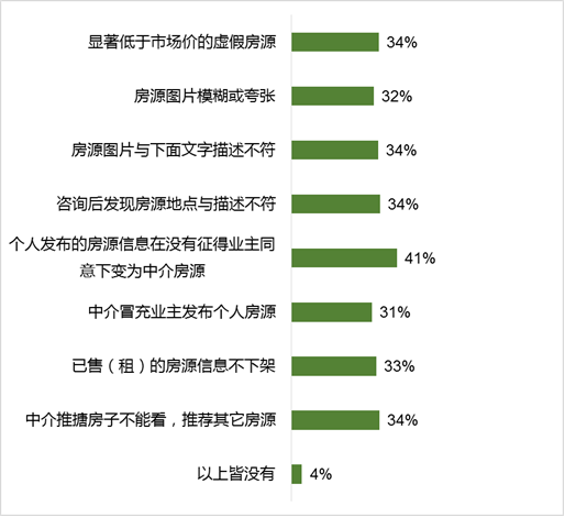 (三)中介擅自发布个人房源或冒充业主。调查发现,有41%的消费者发现在个人房源信息在没有征得业主同意下变为中介房源;有31%的消费者发现中介冒充业主发布个人房源。