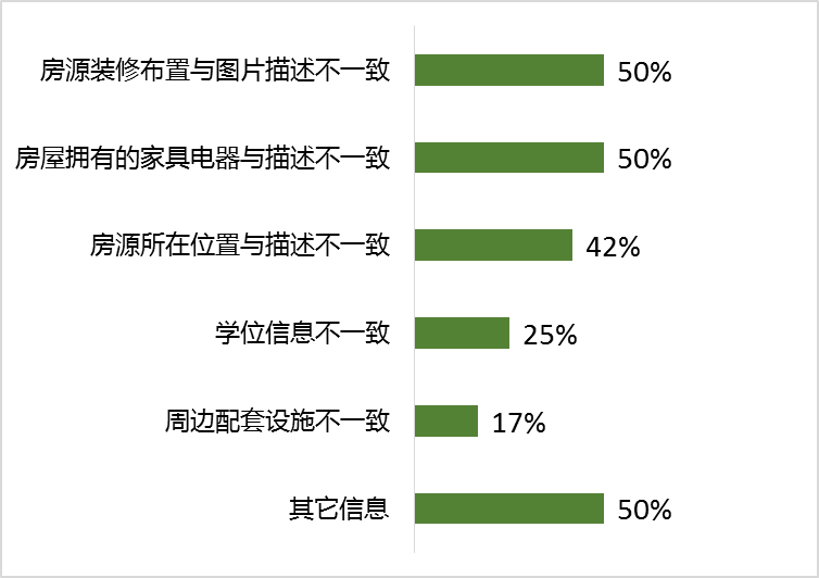 (二)房源信息描述与实际不一致。调查发现,有34%的消费者发现线上房源图片与文字描述不符;有34%的消费者咨询后发现房源地点与描述不符。在体察中也发现有同样的问题,有16%的房源信息不一致,其中,50%的志愿者发现装修布置不一致;50%的志愿者发现拥有的家具电器不一致;42%的志愿者发现房源位置不一致;25%的志愿者发现学位信息不一致;17%的志愿者发现周边配套设施不一致。如图2所示。