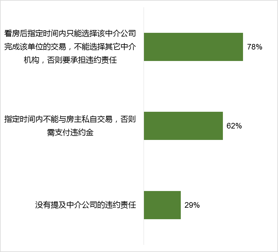三是设置不合理格式条款。调查发现,为防止“跳单”,在看房前不少中介要求消费者签署《看房确认书》或《看房协议》,其中协议中设有不合理的格式条款。主要包括“看房后指定时间内只能选择该中介公司完成该单位的交易,不能选择其它中介机构,否则要承担违约责任”条款(占78%)、“指定时间内不能与房主私自交易,否则需支付违约金”条款(占62%);另外还有消费者指出相关协议“没有提及中介公司的违约责任”的条款(29%),只单方面规定了消费者的义务,属于不公平条款。如图5所示。