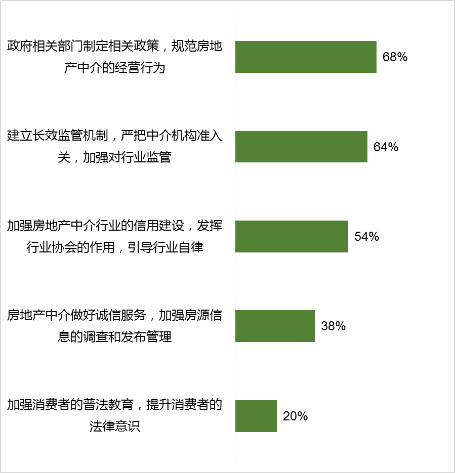 (二)消费者对房地产中介服务总体满意度不高,希望通过加强监管、信用建设等方面改善。调查数据显示,逾5成消费者对房地产中介服务满意度评价一般或不满意。受访消费者分别从加强监管、信用建设及普法方面对改善房地产中介服务提出建议。其中,68%的消费者建议“政府相关部门制定相关政策,规范房地产中介的经营行为”;64%的消费者建议“建立长效监管机制,严把中介机构准入关,加强对行业监管”;54%的消费者建议“加强房地产中介行业的信用建设,发挥行业协会的作用,引导行业自律”;38%的消费者建议“房地产中介做好诚信服务,加强房源信息的调查和发布管理”;20%的消费者建议“加强消费者的普法教育,提升消费者的法律意识”。如图9所示。