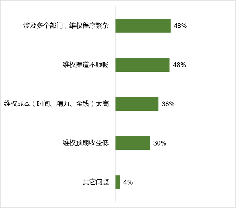 对于满意度不高的主要原因,48%的消费者认为是维权涉及多个部门、维权程序繁杂及维权渠道不顺畅;38%的消费者认为是维权成本高;30%的消费者认为是维权预期收益低。如图8所示。